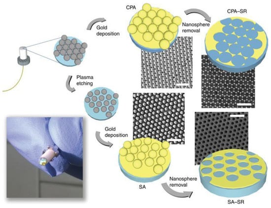 - Pisco, M.; Galeotti, F.; Quero, G.; Grisci, G.; Micco, A.; Mercaldo, L.V.; Veneri, P.D.; Cutolo, A.; Cusano, A. Nanosphere lithography for optical fiber tip nanoprobes. Light Sci. Appl. 2017, 6, e16229. [Google Scholar] [CrossRef]