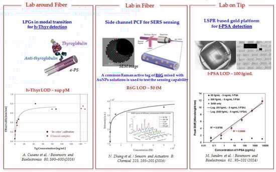 - SERS lab-in-fiber platforms with enhancement factors up to 107 were recently demonstrated for detection at fM levels [57].