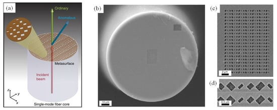 - Principe, M.; Consales, M.; Micco, A.; Crescitelli, A.; Castaldi, G.; Esposito, E.; la Ferrara, V.; Cutolo, A.; Galdi, V.; Cusano, A. Optical fiber meta-tips. Light Sci. Appl. 2017, 6, e16226. [Google Scholar] [CrossRef]