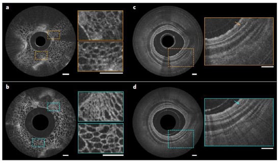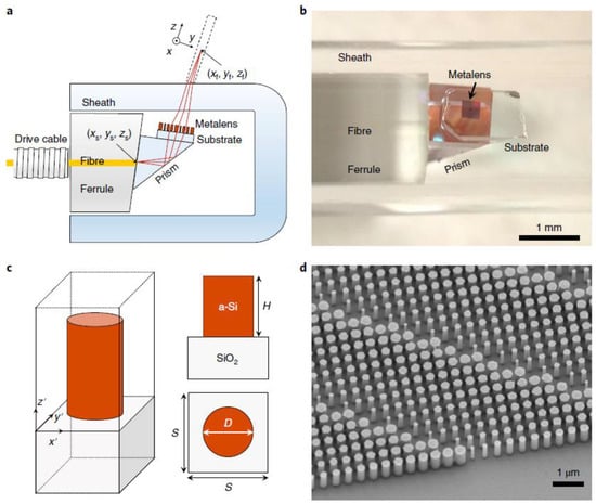 - Pahlevaninezhad, H.; Khorasaninejad, M.; Huang, Y.; Shi, Z.; Hariri, L.P.; Adams, D.C.; Ding, V.; Zhu, A.; Qiu, C.; Capasso, F.; et al. Nano-optic endoscope for high-resolution optical coherence tomography in vivo. Nat. Photonics 2018, 12, 540–547. [Google Scholar] [CrossRef] [PubMed]