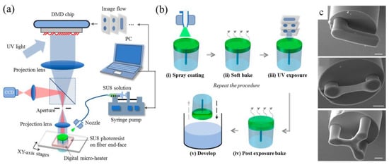 - Williams, H.E.; Freppon, D.J.; Kuebler, S.M.; Rumpf, R.C.; Melino, M.A. Fabrication of three-dimensional micro-photonic structures on the tip of optical fibers using SU-8. Opt. Express 2011, 19, 22910–22922. [Google Scholar] [CrossRef]