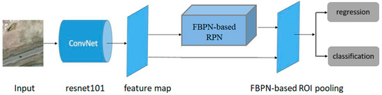 Faster RCNN is one of the state-of-the-art detection frameworks, its simplicity and robustness have attracted a lot of researchers since 2015. It has been proven that faster R-CNN achieves the good detection accuracy on various datasets, such as PASCAL VOC 2007, 2012, and MS COCO [9]. Instead of selective search used in [8], faster RCNN utilizes a RPN for generating high-quality region proposals. Then these region proposals are fed upstream into the regression network and classification network. In the proposed framework, FBPN is adopted to faster RCNN because it can combine features from shallow layers and deep layers which are suitable for vehicle detection in aerial images. It can be seen from Figure 1, the FBPN-based RPN and FBPN-based RoI pooling are two important parts of the proposed framework. FBPN-based RPN is designed to generate region proposals and FBPN-based RoI pooling is used to extract features. Resnet-101 model [3] is selected as the backbone network instead of the VGG-16 model. Many papers have revealed that the network depth is important for performance improvement, and some nontrivial visual detection tasks have also greatly benefited from very deep models [23,24]. According to our experiments, Resnet-101 model performs better than VGG-16 in aerial images detection.