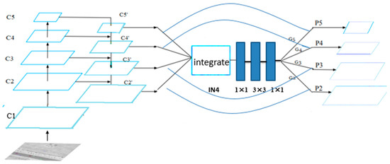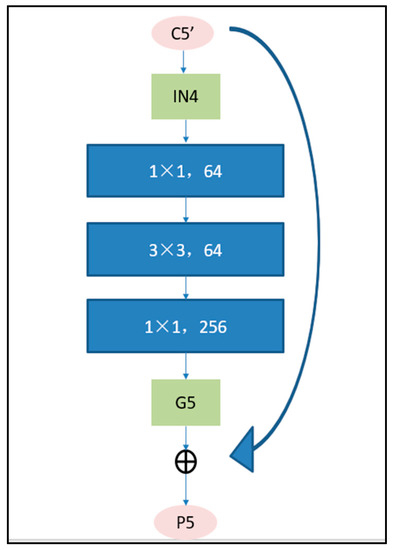 The balanced feature IN4 is then rescaled using the same but reverse procedure to strengthen the original features. IN4 can be further refined to get better feature expression using the 1 × 1, 3 × 3, 1 × 1 convolutions. With this method, features from low-levels to high-levels are aggregated at the same time. The aggregated features are {G2, G3, G4, G5}. The final feature P is the combination of G and C. For example, P5 is the combination of C5 and G5. The detailed process is shown in Figure 3. The outputs {P2, P3, P4, P5} are used for object detection following the same pipeline in FPN.