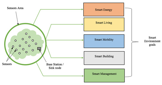Built on information networks around citizens, a smart environment is a “hi-area” composed of several electronic sensor devices that collect some specific data from a specific geographic area (sensor area). These data are processed and analyzed to be made available to the users. Designed to optimize resources and for sustainable development, the technology behind the smart environment is to provide a livable environment. From smart mobility, smart building, smart infrastructure, smart energy, and smart management, smart environments have been contributing immensely in the analog to digital transition of humankind. The basic components in a smart environment are depicted in Figure 1.