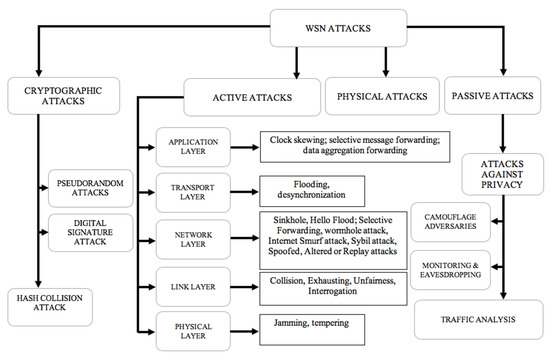 Figure 2 gives a classification of the attacks that can be performed against the WSNs. A physical attack is mentioned when there is physical contact of the sensor with the physical environment, such as individuals intentionally or unintentionally disrupting the network through touch or movement and thus destroying the network. With inactive attacks, a malicious person (hacker) attempts to manipulate the transmitted message. The manipulation concerns the modification or the removal of the message that is being sent in the network. By doing so, the hacker can inject his traffic or replay messages that have already been sent. This technique causes a disturbance of the network operation or a denial of service (DoS) [29]. The active attacks can be initiated on five different layers of communication protocols [28,30]: physical layer attacks (where an attacker easily jams or intercepts any ongoing signal) [31], link-layer attacks (here, the attack is performed against the Media Access Control Protocol [32]), network layer attacks (including hello flood, wormhole attack, Sybil attack, selective forwarding, spoofed, and altered or replayed routing information [33,34]), transport layer attack (which mainly concerns flooding and desynchronization [33]), and the application layer attack, where an attacker attempts to overload the network nodes with sensor stimuli, triggering the network to forward massive volumes of traffic to a base station [35]. The application layer attacks include clock skewing, selective message forwarding, and data aggregation forwarding [36].