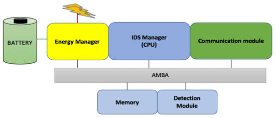 The new proposed intrusion detection system (IDS) is an electronic device capable of ensuring a perfect security scheme for wireless sensor networks inside a smart environment. The IDS architecture is centered on three (3) functional modules: an energy module, a detection module, and a communication module. The device supports the IEEE (Institute of Electrical and Electronics Engineers) 802.15.4 protocol and is also equipped with a Random-Access-Memory (RAM) and a Read-Only-Memory (ROM) for data and programs’ storage. The modules are interconnected using an advanced microcontroller bus architecture (AMBA). The AMBA is a commonly used standard to interconnect the System on Chip (SoC) design [48]. A general overview of the IDS is presented in Figure 3.