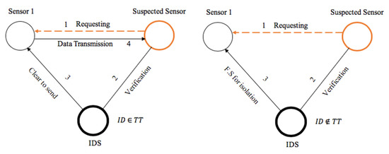 Every IDS periodically conducts a check-up of the sensor network. This enables the IDS to ensure the accuracy of previously stored information to make sure nothing has been changed, just like a sensor updating process. The IDS starts by getting access to the “trust table.” Basically, the system verifies if the number of the previously stored sensors, NS, is still the same compared to the new updated number. This is done by just comparing two values. Considering NS, the value of the stored number of sensors, and NS’, the updated value of the stored number of sensors at the present time, Ta. If the values are the same (NS = NS’Ta) then the IDS concludes that there were no new malicious entries. On the other hand, if NS ≠ NS’, then the IDS concludes that there have been sensor entries into the network. Therefore, the intruder is located, and its information is saved in the device memory in the list of blacklisted sensors and broadcasted to the other sensors of the network through the feedback signal (F.S). The sensors, upon receiving the message, proceed to the isolation of the blacklisted sensor by avoiding communication with it in the future. If D is the intrusion detection process of an IDS, the detection process can be presented as: