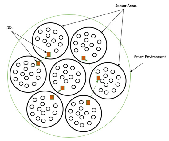 Figure 7 shows a smart environment that includes several sensors distributed into various sensor areas. Also called cells, a specific IDS manages each sensor area. The IDSs are also involved in inter-cells data transmission, where they ensure the authenticity of the incoming and outgoing data from their respective cells to the other cells in the smart environment.