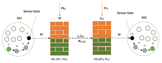 As shown in Figure 10, IDS1 and IDS2 are responsible (locally) for the message transmission and the detection of any entry attempt in their respective sensor areas. The sensor gate in sensor area 1 is sensor 4 (S4), while the sensor 5 is the sensor gate in sensor area 2 (SA2). The sensor gate is the last sensor in the routing chain to transfer the data to the IDS. The selection of the sensor gate is not predetermined and depends on the transmission route whenever a transmission is to be engaged. In this scenario, sensor S1 starts transmission after the route has been established in a multi-hop communication manner. This means that the data is transferred from sensor to sensor until it reaches the sensor gate, which also relays it to IDS1. Once IDS1 receives the data, it will then encrypt the data using the public key (PK2) shared by the IDS2 during the initialization period. The encrypted message, EM, is now forwarded to IDS2 through γ1. Once IDS2 receives the data, it will go ahead and decrypt the message to be sent to sensor 5 (S5), which is the sensor gate in sensor area 2. The data or message is now transferred to the sink node or BS following the routes S6, S7, and BS, as viewed in Figure 10.