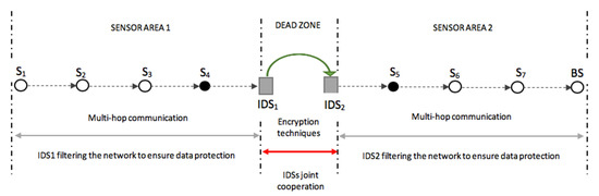 As presented in Figure 8, the dead zones are the ones that are not covered by any IDS. The presence of the dead zones might be a vulnerability to the network, thus leading to a security hole. A malicious person can also try to intercept or alter the data while it is passing through this hole, thereby disrupting the security of the entire smart environment. To guarantee the security of transmitted data while it is in a dead zone, each IDS encrypts the data before forwarding from its sensor area to another sensor area.