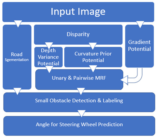 The overall pipeline is graphically illustrated in Figure 1. The system input consisted of optical encoders used in applications for angle detection as a SAS in vehicles and two stereo images, which were used to calculate depth using the SGBM algorithm (semi-global block matching) proposed by Hirschmuller [64]. The depth variance and color images were used to calculate three different cues, i.e., image gradient, disparity variance, and depth curvature. These three cues were combined to a unary potential in an MRF with an additional pairwise potential. Then, the standard graph cuts were used to obtain the obstacle. In addition, deep learning-based semantic segmentation [65] was used to segment the roads and filter out the abnormal values.