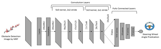 In our research, we have implemented an autonomous driving model similar to DAVE-2, i.e., an end-to-end autonomous driving model [18]. Here, we train the weights of the network to minimize the average square error between the steering command issue. As shown in Figure 3, the network receives an obstacle detection and labeling image of 400 × 600 × 3 pixels and generates a steering wheel angle as output. This network architecture consists of 11 layers, including 1 lambda layer, 1 normalization layer, 5 convolution layers, and 4 fully connected layers. We use 5 × 5 kernel and 2 × 2 stride in the first three convolution layers and 3 × 3 kernel and 1 × 1 stride used in last two convolution layers. The whole network contains 7,970,619 trainable parameters.