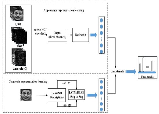 In recent years, the scale of expression databases has been expanded, showing rich diversity, and the computer hardware processing ability has been greatly improved, as well as the successful application of deep learning technology in various fields. Facial expression recognition technology is gradually moving from laboratory based tests to challenging real scene recognition. The ability of traditional handcrafted descriptors to express information is limited, most of which are shallow feature representations, failing to capture changes unrelated to expressions. Due to the powerful learning ability of deep learning technology, deep learning technology is gradually becoming widely used in facial expression recognition. Deep Belief Network (DBN) [] is used to learn feature representations in a semi-supervised way. Deep AutoEncoder (DAE) [] and Deep Sparse AutoEncoder (DSAE) [] models code samples in an unsupervised way, learning a small number of features with great contribution to classify the expressions. The Convolutional Neural Network (CNN) [] model is introduced because of its robustness to affine transformations. Based on the improvement of the CNN model, Region-CNN (R-CNN) is proposed in []. For dynamic sequences, 3D CNN [] is utilized to present the spatial-temporal information between continuous frames, and the Recurrent Neural Network (RNN) [] is a another structure that can express time series information well. Long Short Term Memory (LSTM) [], which is proposed by Hochreiter and Schmidhuber, is a representative RNN. It has been widely promoted for dynamic expression recognition. Goodfellow et al. [] introduced the Generative Adversarial Network (GAN), which is mainly for generating samples by training against each other through generator and discriminator. The Conditional Generative Adversarial Network (cGAN) [] is argued to generate neutral faces corresponding to expression samples. Then expressive information can be captured in the cGAN model [].