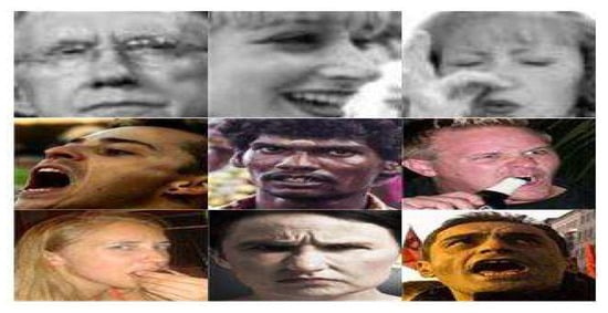 - Li, S.; Deng, W.; Du, J. Reliable crowdsourcing and deep locality-preserving learning for expression recognition in the wild. In Proceedings of the IEEE Conference on Computer Vision and Pattern Recognition, Honolulu, HI, USA, 21–26 July 2017; pp. 2852–2861. [Google Scholar]