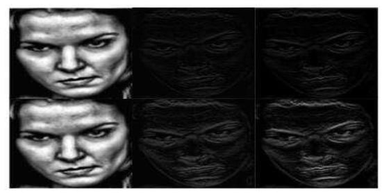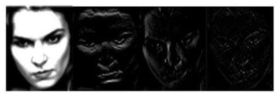 The illumination normalized expression samples of frequency domain transform based on DWT2 in RAF Compound. Approximate component, horizontal detail component, vertical detail component, diagonal detail component from left to right. Copyright reference: http://www.whdeng.cn/raf/model1.html#dataset.
