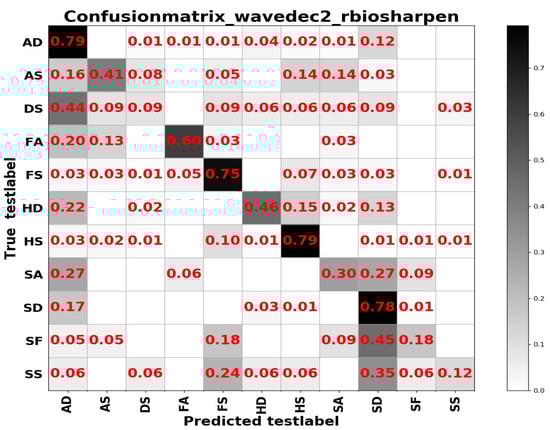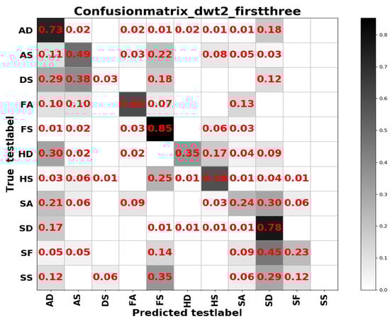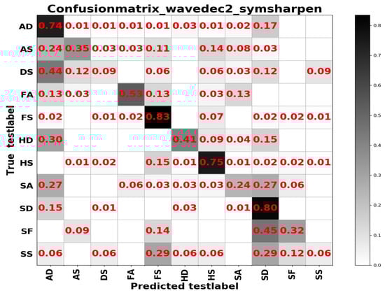 The model parameters for appearance feature learning are set as follows: we set the epoch to 20; 0.001, 0.0001, and 0.00001 are selected to find the best learning rate, the size of batch is set to 64 or 128; and Adam, RMSprop, SGD are tried separately. It should be noted that fine tuning ResNet50 on dwt2_latterthree (rbio3.1) performs worse than other three frequency domain transforms, thus, dwt2_latterthree (rbio3.1) was not considered to continue subsequent learning on RAF Compound. The results of the RAF Compound test set based on different input channels of ResNet50 fine tuned on FER2013 are shown in Table 4; the results of the RAF Compound test set based on ResNet 50 pretrained on FER2013 and RAF Basic are displayed in Table 5.