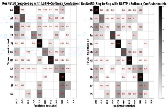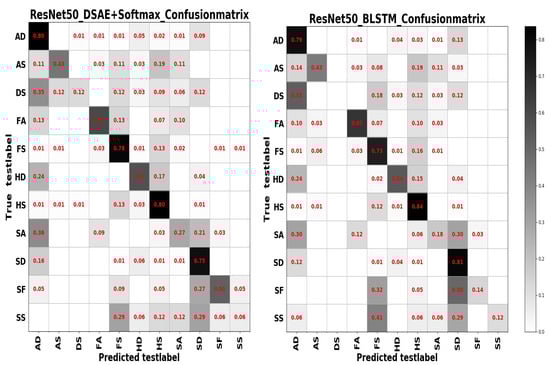 For model settings, we only replace the output layer of ResNet50 with the number of category tags for the current training set. In addition, we define the structures of deep SAE, stacked LSTM, BLSTM and Sequence-to-Sequence with stacked LSTM and BLSTM from scratch. We stack several LSTMs and a softmax layer to generate a stacked LSTM model, and we set the number of categories of the current training set to the number of nodes in the softmax layer. The stacked BLSTM model is built similar to the stacked LSTM model. In addition, the stacked LSTM and BLSTM are also embedded in the Sequence-to-Sequence model, which is concentrated on Sequence-to-Sequence mapping to generate compressed coding representations. The encoder and decoder for the deep SAE are built with several dense layers respectively. It is worth mentioning that the input for stacked LSTM and BLSTM and Sequence-to-Sequence is a three-dimensional vector, which contains batchsize, timesteps and input_features. However, the deep SAE’s input is a one-dimensional vector.