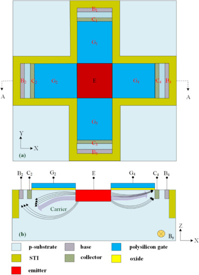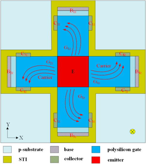 The magnetic micro sensor is composed of an x/y-MAGFET and a z-MAGFET. The x/y-MAGFET detects the MF in the x- and y-axis. The z-MAGFET senses the MF in the z-axis. Figure 1a illustrates the structure of the x/y-MAGFET, where B1, B2, B3, and B4 are the bases of the x/y-MAGFET; C1, C2, C3, and C4 are the collectors of the x/y-MAGFET; G1, G2, G3, and G4 are the gates of the x/y-MAGFET; and E is the emitter of the x/y-MAGFET. The x/y-MAGFET uses shallow trench isolation (STI) oxide to limit the current movement direction and to reduce the leakage current.