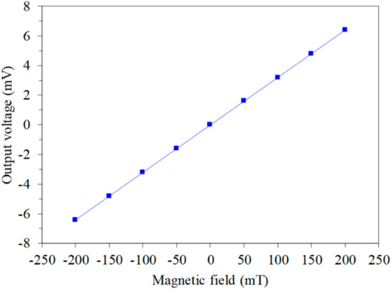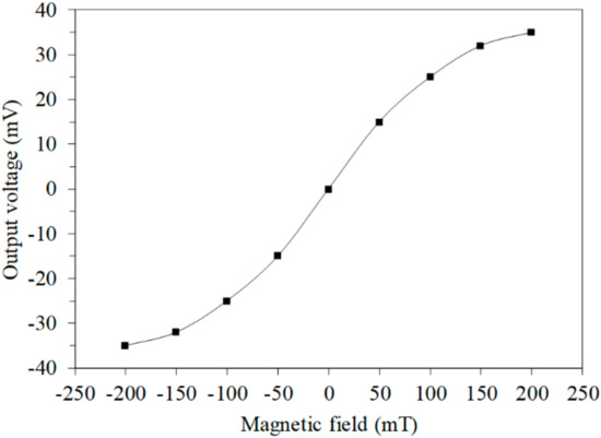 The finite element method software Sentaurus TCAD was used to analyze the MMS characteristic. A model of the x/y-MAGFET (Figure 1a) was established, and the model was meshed using the Delaunay triangulation approach. The electrical and MF coupling effect for the x/y MAGFET was analyzed using the Poisson electron hole method. The carrier density distribution of the x/y-MAGFET was solved using the Bank–Rose method. Figure 3 shows the simulated OV for the MMS in the x-axis MF. In the simulation, the voltage of the bases and collectors for the x/y-MAGFET was 3.3 V. The bases and collectors connected with a resistance of 1 kΩ, respectively. The voltage of the gates for the x/y-MAGFET was 0.4 V. An MF in the x-axis was provided to the x/y-MAGFET. The simulated results showed that the MMS OV in the x-axis MF changed from −35 mV at −200 mT to 35 mV at 200 mT. The x/y-MAGFET was a symmetrical structure, so the MMS characteristic in the y-axis MF was the same as that in the x-axis MF. Thereby, the simulated OV of the MMS in the y-axis MF was the same as that of the MMS in the x-axis MF.