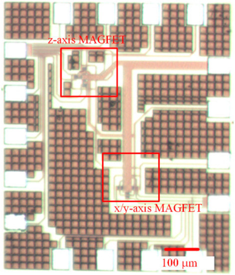 These magnetic micro sensors [16,17,18,19,21,23,25,26] fabricated by CMOS technology were 1-axis MF sensors. The MMS developed by Lin [18] was a three-axis sensor, but its cross-sensitivity was high because the structure of the MMS had only one magnetotransistor. Therefore, this work develops a three-axis MMS fabricated by the commercial CMOS process. To avoid the cross-coupling effect and reduce the cross-sensitivity, the MMS was composed of two magnetic field effect transistors (MAGFETs): an x/y-MAGFET and a z-MAGFET. The x/y-MAGFET measured the MF in the x- and y-axis, and the z-MAGFET measured the MF in the z-axis.