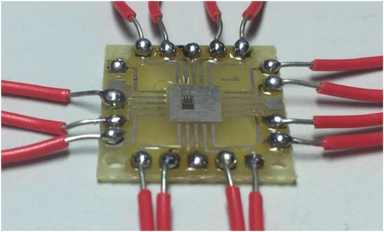 The magnetic micro sensor consisted of an x/y-MAGFET and a z-MAGFET. Figure 1 shows the structure of the x/y-MAGFET, and Figure 2 shows the structure of the z-MAGFET. The layout of the x/y-MAGFET was designed according to the structure in Figure 1. At the same time, the layout of the z-MAGFET was designed in accordance with the structure in Figure 2. The MMS was manufactured utilizing the commercial CMOS process [27,28,29]. According to the layout of the MMS, the Taiwan Semiconductor Manufacturing Company (TSMC) made the MMS based on the commercial 0.18 μm CMOS process. Figure 5 demonstrates an optical image of the MMS after completion of the CMOS process. As shown in Figure 5, the MMS chip has a z-MAGFET and an x/y-MAGFET. To measure the characteristic of the MMS chip, the MMS chip was wire-bonded on a printed circuit board. Figure 6 shows a picture of the MMS after wire-bonding.
