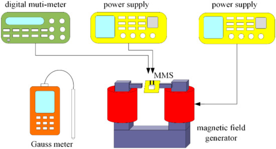 Figure 7 shows the experimental setup of the MMS. A Gauss meter, a digital multimeter, a magnetic field generator (MFG), and two power supplies were employed to measure the MMS characteristic. The MMS was set in the MFG. One power supply provided power to the MFG, and the other one provided power to the MMS. The MFG produced an MF to the MMS. The magnitude of the MF generated by the MFG was calibrated using the Gauss meter. The MMS OV was recorded using the digital multimeter.