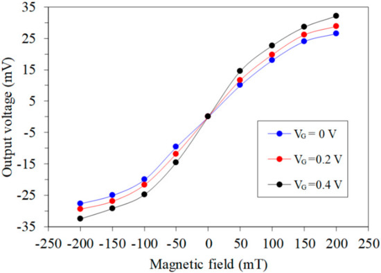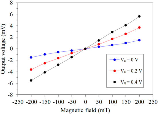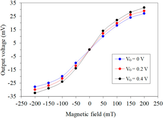 The characteristic of the MMS in the z-axis MF was tested. A z-axis MF, which was produced by the MFG, was applied to the z-MAGFET. A bias voltage of 3.3 V was applied to the bases and collectors of the z-MAGFET. The gates of the z-MAGFET were applied with different voltages. The bases and collectors connected with a resistance of 1 kΩ. The digital multimeter was used to test the OV of the z-MAGFET. Figure 10 shows the tested OV for the MMS in the z-axis MF, where VG is the gate voltage of the MAGFET. The MMS was insensitive to the MF at VG = 0 V. As the gate voltage increased, the MMS OV became strong. When VG = 0.2 V, the MMS OV changed from −3.6 mV at −200 mT to 3.7 mV at 200 mT. When VG = 0.4 V, the MMS OV increased from −5.6 mV at −200 mT to 5.8 mV at 200 mT. The slope of the curve at VG = 0.4 V was 27.8 mV/T. Therefore, the sensitivity of the MMS in the z-axis MF was 27.8 mV/T. When the Lorentz force acts, the number of carriers (z-MAGFET in Figure 2) deflected to the side is smaller than the number of carriers (x/y-MAGFET in Figure 1) that are deflected upward or downward. Therefore, the output voltage and sensitivity of the z-MAGFET are smaller than that of the x/y-MAGFET.