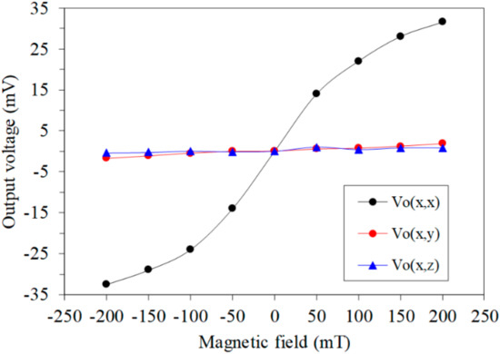 To understand the cross-sensitivity of the MMS, the OV for each axis of the MMS was measured in the same MF. First, an MF in the x-axis was applied to the MMS. The bases and collectors of the x/y-MAGFET and z-MAGFET were applied with a bias voltage of 3.3 V. A gate voltage of 0.4 V was applied to the gates of the x/y-MAGFET and z-MAGFET. The OVs of the x/y-MAGFET and z-MAGFET were measured using the digital multimeter. Figure 11 shows the OV for each axis of the MMS in the x-axis MF, where Vo(x,x) is the x-direction OV of the x/y-MAGFET in the x-axis MF; Vo(x,y) is the y-direction OV of the x/y-MAGFET in the x-axis MF; and Vo(x,z) is the OV of the z-MAGFET in the x-axis MF. As shown in Figure 11, the Vo(x,y) and Vo(x,z) are low in the x-axis MF. The slope of the curve Vo(x,y) was 8.2 mV/T, and the slope of the curve Vo(x,z) was 3.4 mV/T. Thereby, the MMS had a cross-sensitivity of 8.2 mV/T (y-direction output) and a cross-sensitivity of 3.4 mV/T (z-direction output) in the x-axis MF. The sensitivity of the MMS in the x-axis MF was 182 mV/T. Compared to the sensitivity of the MMS, the cross-sensitivity of the MMS in x-axis MF was less than 6%.
