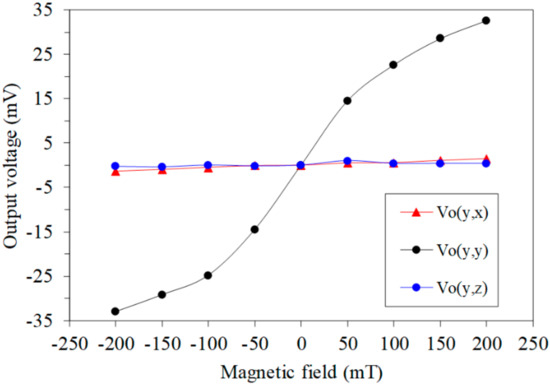 A magnetic field in the y-axis was applied to the MMS. A bias voltage of 3.3 V was applied to the bases and collectors of the x/y-MAGFET and z-MAGFET. The gate voltage of the x/y-MAGFET and z-MAGFET was 0.4 V. The digital multimeter recorded the OV of the x/y-MAGFET and z-MAGFET. Figure 12 shows the OV for each axis of the MMS in the y-axis MF, where Vo(y,x) is the x-direction OV of the x/y-MAGFET in the y-axis MF; Vo(y,y) is the y-direction OV of the x/y-MAGFET in the y-axis MF; and Vo(y,z) is the OV of the z-MAGFET in the y-axis MF. As shown in Figure 12, the Vo(y,x) and Vo(y,z) are low in the y-axis MF. The slope of the curve Vo(y,x) was 7.8 mV/T, and the slope of the curve Vo(y,z) was 3.2 mV/T. Thereby, the MMS had a cross-sensitivity of 7.8 mV/T (x-direction output) and a cross-sensitivity of 3.2 mV/T (z-direction output) in the y-axis MF. The sensitivity of the MMS in the y-axis MF was 180 mV/T. Compared to the sensitivity of the MMS, the cross-sensitivity of the MMS in y-axis MF was less than 6%.