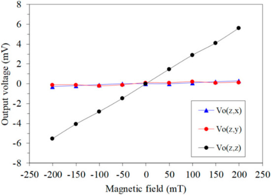 The z-axis MF was applied to the MMS. The gate voltage of the x/y-MAGFET and z-MAGFET was 0.4 V. The bases and collectors of the x/y-MAGFET and z-MAGFET were applied with a bias voltage of 3.3 V. The OV of the x/y-MAGFET and z-MAGFET was recorded using the digital multimeter. Figure 13 shows the OV for each axis of the MMS in the z-axis MF, where Vo(z,x) is the x-direction OV of the x/y-MAGFET in the z-axis MF; Vo(z,y) is the y-direction OV of the x/y-MAGFET in the z-axis MF; and Vo(z,z) is the OV of the z-MAGFET in the z-axis MF. As shown in Figure 13, the Vo(z,x) and Vo(z,y) are low in the z-axis MF. The slope of the curve Vo(z,x) was 1.3 mV/T, and the slope of the curve Vo(z,y) was 1.1 mV/T. Thereby, the MMS had a cross-sensitivity of 1.3 mV/T (x-direction output) and a cross-sensitivity of 1.1 mV/T (y-direction output) in the z-axis MF. The sensitivity of the MMS in the z-axis MF was 27.8 mV/T. Compared to the sensitivity of the MMS, the cross-sensitivity of the MMS in z-axis MF was less than 6%.