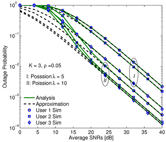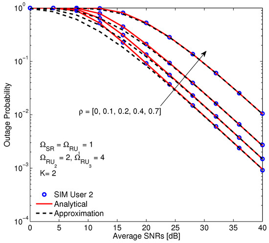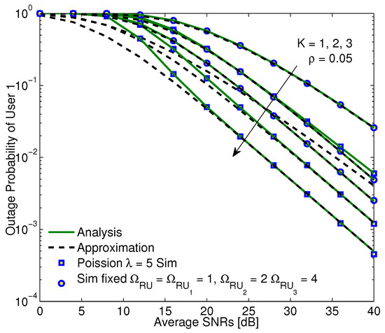 Let and (bit/s/Hz) denote the minimum required data rate of two links, and , respectively. To simplify calculations, set . Therefore, the OP of the th user can be defined as