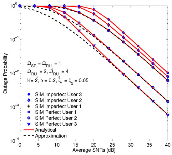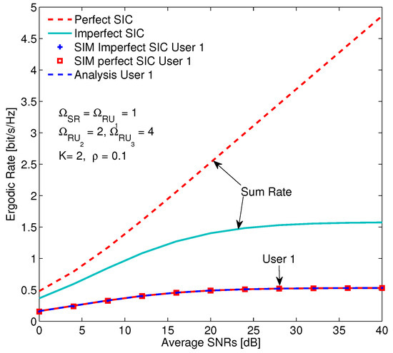 The sum ER of the system is demonstrated in Figure 11 for two cases, i.e., perfect and imperfect SICs. Firstly, the simulation results are the same with analytical results. Secondly, the sum ER in the case of perfect SIC is higher than that in the case of imperfect SIC, especially the gap of them increases when the SINR increases. The reason can be explained as if SINR increases by rising the transmission power, the interference due to imperfect SIC also increases, consequently, the sum ER with imperfect SIC goes up less significantly than that with perfect SIC. Finally, the ERs of user 1 are the same in both cases because when user 1 decodes the signal, the SIC scheme is not used.