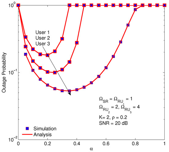 Figure 9 demonstrates the impact of the time fraction of EH, , on the OP of users. In fact, the optimal is a sophisticated function of the channel and system parameters. The smaller results in the smaller energy for relay nodes, however, the larger brings the smaller transmission power for communication of the BS. Therefore, if the increases from 0 to 1, the OP reduces to an optimal value and then increases again. As a result, the optimal corresponding to the smallest OP is determined by this plot. In the figure, the minimum values of OP for every user are different although the setting parameters are the same. Moreover, the optimal time duration for EH of user 3 is the largest. The reason is that the power allocation for user 3 is the smallest, consequently, it needs longer time duration for EH to ensure the transmission power of the relay node to forward signals.