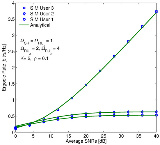 Figure 10 demonstrates the ER of users versus SINR in the case of perfect SIC. In this figure, the ER can be considered to be a function of the mean SINR, based on the derived results in (55) and (56). Figure 10 shows that the ERs of users 1 and 2 increase negligibly in the low SINR region and remain stable in the high SINR region; however, that of user 3 increases exponentially. There is a trade-off between the complexity and the performance, i.e., user 1 directly detected its own signal, whereas the users 2 and 3 have the first-order and second-order of the SIC, respectively.