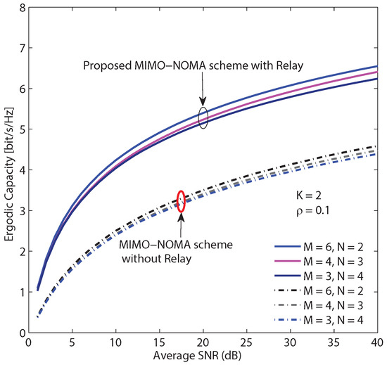 Before investigating the ergodic rate of the system, we examine the result that had been shown in [44], i.e., the transmission power of the relay is often smaller than the transmission power of the BS because the relay node is supplied by harvesting energy. In Figure 4, the probabilities of and are compared. It is clear that is always less than . Therefore, the probability that is always higher than the probability that . This ensures that and it can be considered to be a crucial factor that limits the performance of such systems.