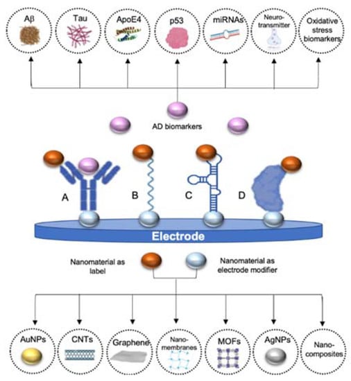 Schematic representation of the main AD biomarkers and the typical nanomaterials used in electrochemical biosensors for AD detection (gold nanoparticles (AuNPs), carbon nanotubes (CNTs), graphene, nanomembranes, metal-organic frameworks, silver nanoparticles (AgNPs) and nanocomposites). A. Using antibodies as recognition element, B. using oligonucleotides as recognition element, C. using aptamers as recognition element and D. using affinity proteins as recognition elements. In all cases nanomaterials may be used both to modify the electrode and as label, not being necessary the use of both nanomaterials at the same time in all the detection strategies.