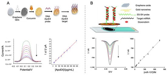 Electrochemical biosensors for the detection of DNA and RNA biomarkers of AD. (A). Schematic representation of a ITO electrode modified with graphene QDs, electropolymerized curcumin as reporter signal and DNA ApoE4 probe for the detection of ApoE4 gene using a DNA probe as recognition element (top) and differential pulse voltammetric (DPV) curves of the detected ApoE4 at different concentrations, representing an increase in the resistance with higher concentrations of ApoE4 and the corresponding calibration curve (bottom). Reprinted from [83]. Copyright (2018) with permission from Elsevier. (B). Schematic representation of miRNA biosensor based on the modification of a SPCE using GO, gold nanowires, thiolated RNA probe as recognition element and doxorubicin as reporter signal due to its intercalating capacity (top) and DPV curves of decreasing concentrations of target miRNA and the corresponding calibration curve (bottom). Reproduced from [87]—Published by The Royal Society of Chemistry.
