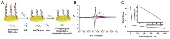 (A) Schematic representation of an electrochemical biosensor for the detection of ApoE4 gene using Fc-capped gold nanoparticles conjugated with streptavidin as labels and biotinylated DNA as capture probe. The biosensor principle is based on the specific cleavage of HhaI to double stranded DNA helix. 6-mercaptohexanol (MCH) is added as blocking agent. (B) CV responses of (a) biotinylated probe after hybridization with 50 pM ApoE4 gene, (b) same biotinylated probe after the addition of HhaI restriction enzyme and (c) unbiotinylated probe after hybridization with 50 pM ApoE4 gene; and (C) representation of the dependence between current (µA) and different concentrations of ApoE4 gene, where the insert represents the linear part between 0.1 and 5 pM. Reprinted by permission from: Springer Nature, Microchimica Acta, [90], 2018.