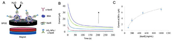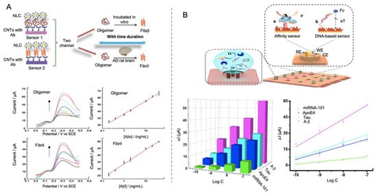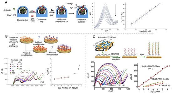 Amor-Gutiérrez et al. [95] developed an immunosensor for the detection of unfolded p53 in blood samples (Figure 4A). Using a SPCEs modified with AuNPs for the immobilization of monoclonal antibodies against p53, they developed a competitive biosensor able to detect unfolded p53 by linear sweep voltammetry (LSV), with a LOD of 0.05 nM. The competitive assay consisted in the incorporation on the biosensor of biotinylated and non-biotinylated p53 for its specific detection by the immobilized antibodies. After that, streptavidin labelled with alkaline phosphatase was first added to the electrode for the binding to only biotinylated p53. By adding 3-indoxyl phosphate and, afterwards, silver nitrate solution, alkaline phosphatase catalyzed the enzymatic reduction of silver and generated the electrochemical signal by the anodic stripping of the produced Ag0. One of the main strengths of this work is the evaluation of the performance of the biosensor generated in real blood samples of patients with MCI and AD, showing no significant differences with ELISA results.