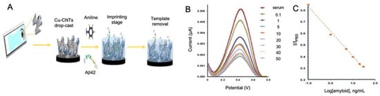 Electrochemical biosensors for the detection of AD peptides using CNTs as electrode modifier. (A) Representation of the generation of a MIPs for the detection of Aβ peptide using electropolymerized aniline and Cu-CNTs as electrode modifier, (B) SWV measurements of the modified electrode at different Aβ concentrations in human serum samples and (C) the corresponding calibration curve. Reprinted from [102]. Copyright (2018) with permission from Elsevier.
