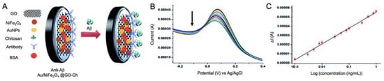 (A) Schematic representation of an immunosensor for the detection of Aβ peptide using GO, chitosan, AuNPs and NiFe2O4 NPs as electrode modifiers for the immobilization of antibodies and improving sensitivity; (B) DPV response of the biosensor at different Aβ peptide concentrations, revealing the decrease in the signal recorded while concentration is increased and (C) calibration curve showing linearity. Reproduced from [104]—Published by The Royal Society of Chemistry.