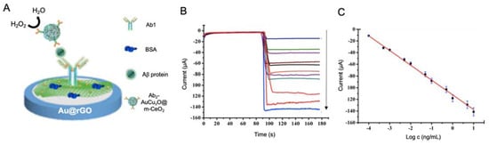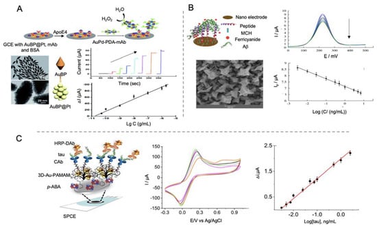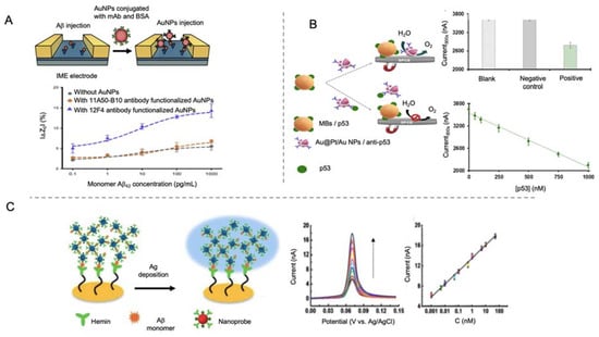 AuNPs have also been used as labels for AD peptide biomarkers sensing [105,106,107,108,109,110,111]. Yoo et al. [106] designed a sandwich-type immunosensor for the detection of Aβ peptide by using an antibody-modified interdigitated microelectrode and AuNPs conjugated with antibodies as labels for signal amplification (Figure 7A). By measuring impedance changes in the presence of Aβ peptides, they obtained a LOD of 22.15 fM, what indicates that the use of AuNPs as labels for Aβ peptide is as valid as the use of AuNPs as electrode modifiers [94].