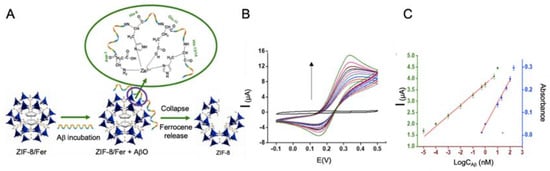 - Qin, J.; Cho, M.; Lee, Y. Ferrocene-Encapsulated Zn Zeolitic Imidazole Framework (ZIF-8) for Optical and Electrochemical Sensing of Amyloid-β Oligomers and for the Early Diagnosis of Alzheimer’s Disease. ACS Appl. Mater. Interfaces 2019, 11, 11743–11748. [Google Scholar] [CrossRef]