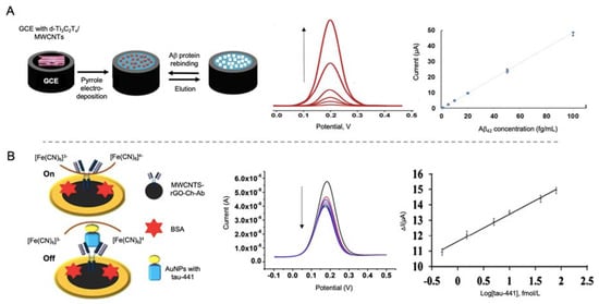 In AD biomarkers detection, MIPs were first used for the detection of Aβo by Moreira et al. [123] using α-cyclodextrin as polymeric matrix, achieving a LOD of 44 pM. In a subsequent study [102], the same group improved the performance of the biosensor by using aniline as polymeric matrix and CNTs modified with copper oxide nanoparticles as conductive substrate for improving electrocatalytic activity and electron transferability (Figure 5). Aβo detection was performed by cyclic voltammetry (CV) and SWV in artificial serum samples with a notable improvement in the performance compared to its previous work, reaching a LOD of 88.6 fM.