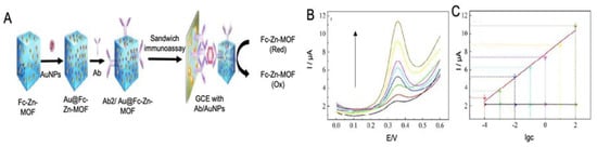 - Hang, J.; Zhang, M.; Chen, G.; Zhang, Y.; Wei, Q.; Zhuo, Y.; Xie, G.; Yuan, R.; Chen, S. Ferrocene covalent-confined in porous MOF as signal tags for highly sensitive electrochemical immunoassay of amyloid-β. J. Mater. Chem. B 2017, 5, 8330–8336. [Google Scholar]