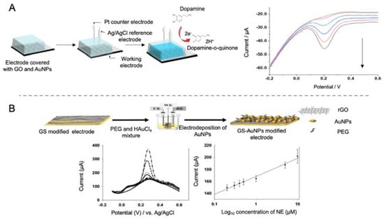 - Park, D.-J.; Choi, J.-H.; Lee, W.-J.; Um, S.H.; Oh, B.-K. Selective Electrochemical Detection of Dopamine Using Reduced Graphene Oxide Sheets-Gold Nanoparticles Modified Electrode. J. Nanosci. Nanotechnol. 2017, 17, 8012–8018. [Google Scholar] [CrossRef]
