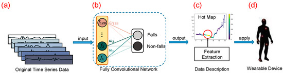 10] and recurrent neural networks (RNNs), where a deep architecture with multiple layers is proposed for automating feature learning from the raw time series data. The algorithm first uses the sliding window to split the sensor data, and then the raw data can be directly used as the classification model input after a simple preprocessing. The convolutional network finds suitable data features through iterative learning of the training dataset, and finally outputs its classification (falls or non-falls) to achieve end-to-end processing. Since a CNN is good at discovering intricate structures in high-dimensional data, the deep learning-based method achieves high fall detection accuracy. However, the application of deep learning in fall detection based on wearable sensors has not been actually used, due to limited computational capacity and energy consumption of wearable devices. In our research, the CAM method [