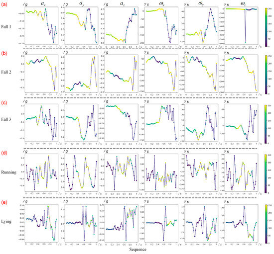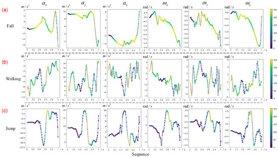For visualization, the importance of the data contributing to fall detection was normalized and mapped to the range of [0,255]. In this way, the importance from low to high can be expressed as a color bar from purple to yellow. The length of the time series after three-layer convolution and pooling is generally inconsistent with the length of the original data input. To visualize the areas in the original data that contribute to the fall detection, the class activation map was upsampled, and the color was superimposed on the original data.