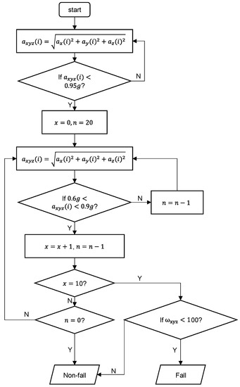 Figure 6c), and the SVM on the start frame is generally around 0.95 g (g for one gravitational acceleration). Therefore, we use 0.95 g and 0.6–0.9 g as the thresholds of SVM for the start frame and early fall phase, respectively. Given that the angular velocity is high in some ADLs, such as lying, shown in