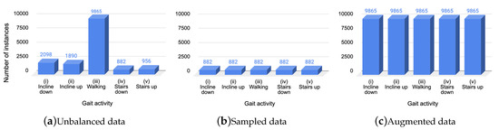 In the recognition of activities and particularly in gait analysis, datasets are usually unbalanced, i.e., there is an unequal number of instances for different classes, in this case, more data from one activity than from the others. One of the reasons for this class unbalance is the fact that the activities performed in naturalistic conditions depend on the daily routine of the people and even their environment, e.g., walking on level ground is the most common activity among people, as opposed to walking stairs [13]. Due to this disparity, the classification models tend to categorize into the class with more instances, the majority class, while at the same time giving the false sense of a highly accurate model [14]. Data augmentation techniques have been proposed in other fields to deal with this problem, being mostly used to balance the number of instances per class.